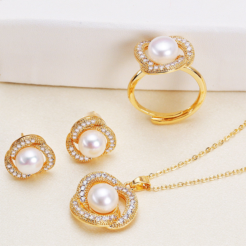 Brass Plated with 18K Gold Genuine Freshwater Pearl Loving Angle Set