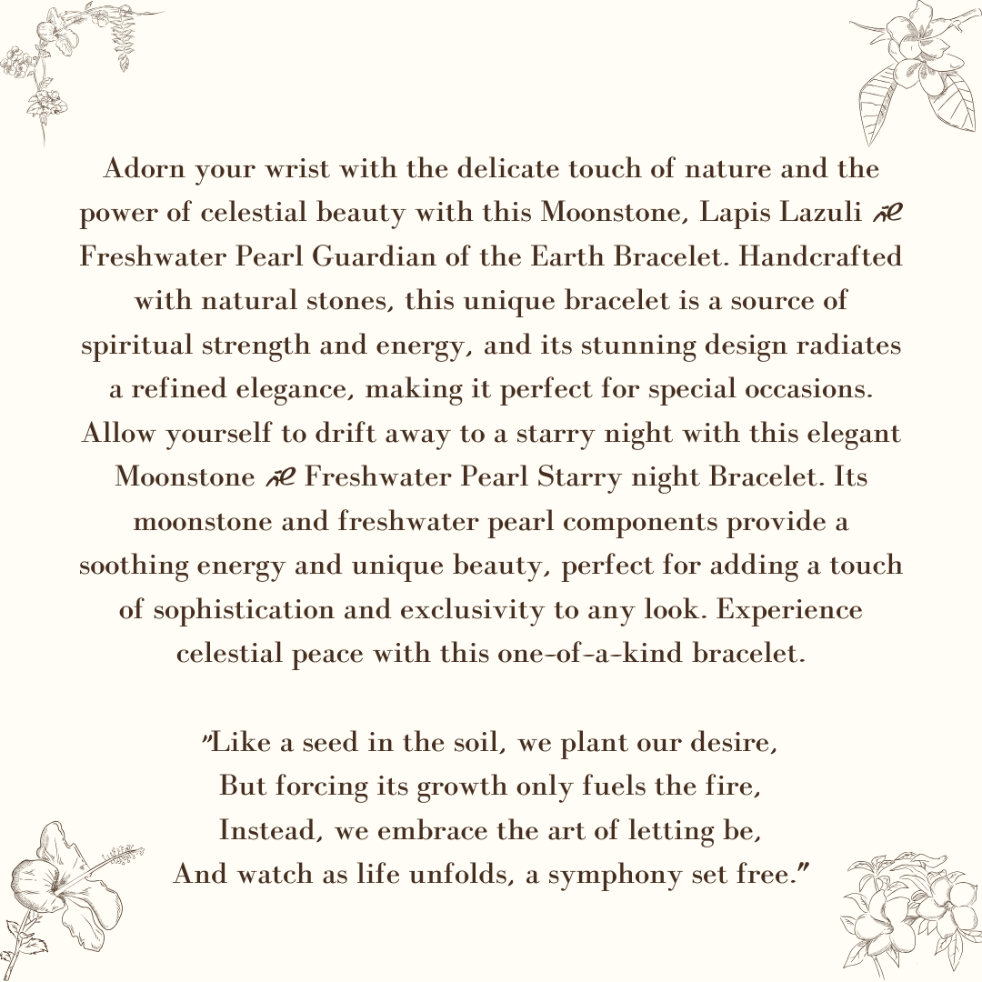 Adorn your wrist with the delicate touch of nature and the power of celestial beauty with this Moonstone, Lapis Lazuli & Freshwater Pearl Guardian of the Earth Bracelet. Handcrafted with natural stones, this unique bracelet is a source of spiritual strength and energy, and its stunning design radiates a refined elegance, making it perfect for special occasions. Allow yourself to drift away to a starry night with this elegant Moonstone & Freshwater Pearl Starry night Bracelet. Its moonstone and freshwater pearl components provide a soothing energy and unique beauty, perfect for adding a touch of sophistication and exclusivity to any look. Experience celestial peace with this one-of-a-kind bracelet